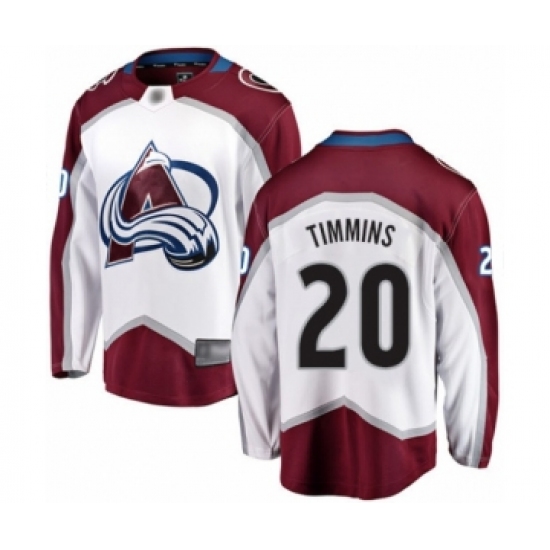 >Men's Colorado Avalanche #20 Conor Timmins Authentic White Away Fanatics Branded Breakaway Hockey Jersey