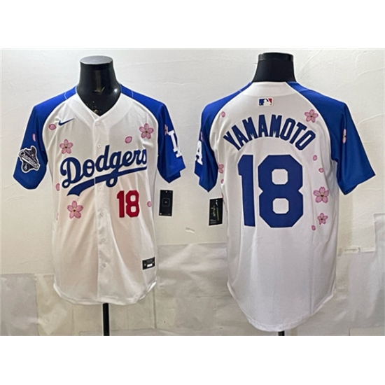 Men's Los Angeles Dodgers #18 Yoshinobu Yamamoto White Royal 2025 World Series Champions Tokyo Series Limited Stitched Baseball Jersey