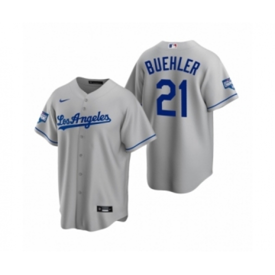 >Men's Los Angeles Dodgers #21 Walker Buehler Gray 2020 World Series Champions Road Replica Jersey