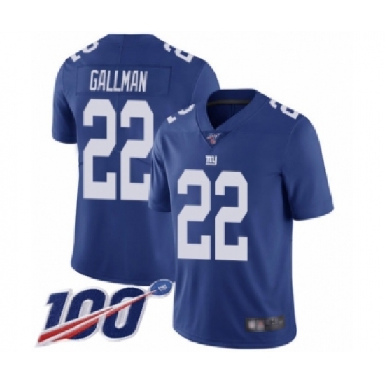 >Men's New York Giants #22 Wayne Gallman Royal Blue Team Color Vapor Untouchable Limited Player 100th Season Football Jersey