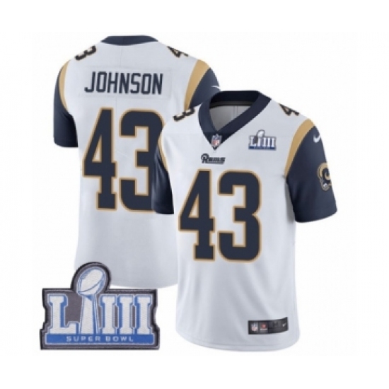 >Men's Nike Los Angeles Rams #43 John Johnson White Vapor Untouchable Limited Player Super Bowl LIII Bound NFL Jersey