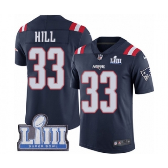 >Men's Nike New England Patriots #33 Jeremy Hill Limited Navy Blue Rush Vapor Untouchable Super Bowl LIII Bound NFL Jersey