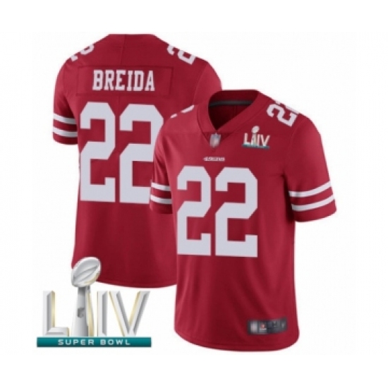Men's San Francisco 49ers #22 Matt Breida Red Team Color Vapor Untouchable Limited Player Super Bowl LIV Bound Football Jersey