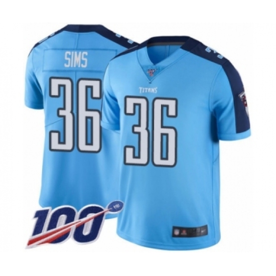 >Men's Tennessee Titans #36 LeShaun Sims Limited Light Blue Rush Vapor Untouchable 100th Season Football Jersey