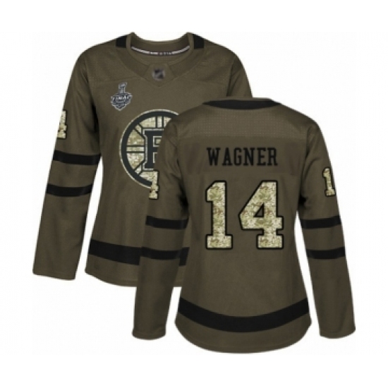 >Women's Boston Bruins #14 Chris Wagner Authentic Green Salute to Service 2019 Stanley Cup Final Bound Hockey Jersey