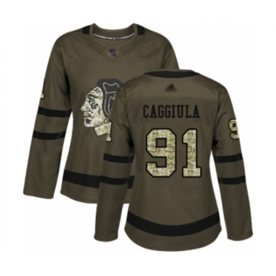 >Women's Chicago Blackhawks #91 Drake Caggiula Authentic Green Salute to Service Hockey Jersey