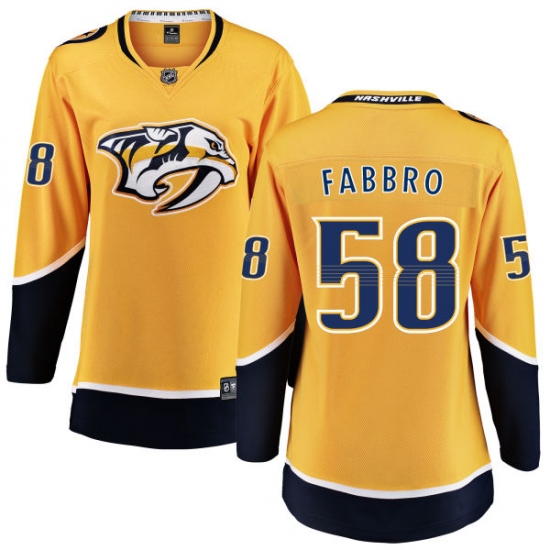 Home>NHL>Nashville Predators>Dante Fabbro>Women's Nashville Predators #58 Dante Fabbro Fanatics Branded Gold Home Breakaway NHL Jersey