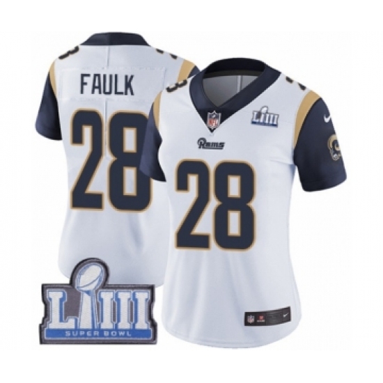 >Women's Nike Los Angeles Rams #28 Marshall Faulk White Vapor Untouchable Limited Player Super Bowl LIII Bound NFL Jersey