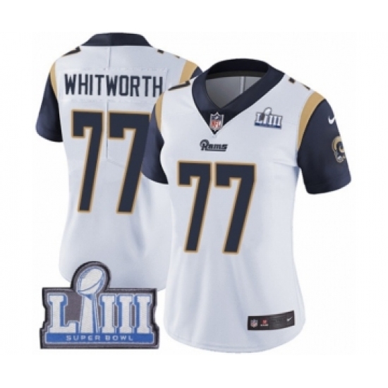 >Women's Nike Los Angeles Rams #77 Andrew Whitworth White Vapor Untouchable Limited Player Super Bowl LIII Bound NFL Jersey