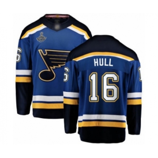 >Youth St. Louis Blues #16 Brett Hull Fanatics Branded Royal Blue Home Breakaway 2019 Stanley Cup Champions Hockey Jersey