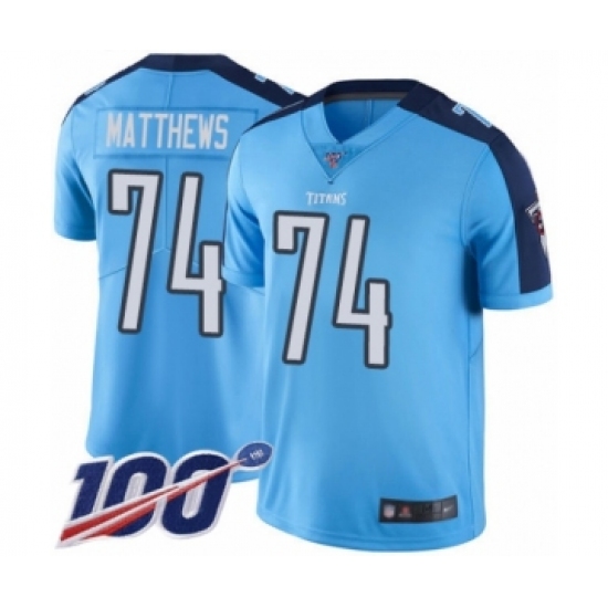 >Youth Tennessee Titans #74 Bruce Matthews Limited Light Blue Rush Vapor Untouchable 100th Season Football Jersey