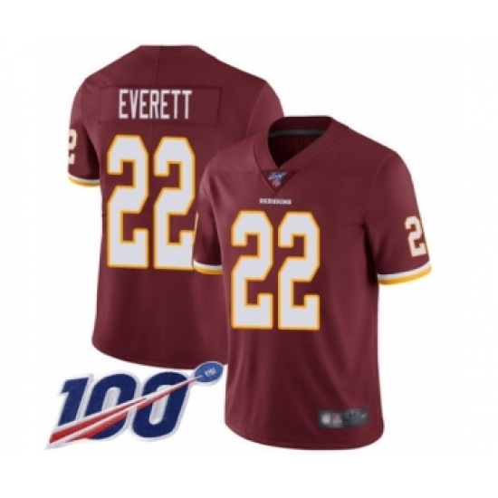 >Youth Washington Redskins #22 Deshazor Everett Burgundy Red Team Color Vapor Untouchable Limited Player 100th Season Football Jersey