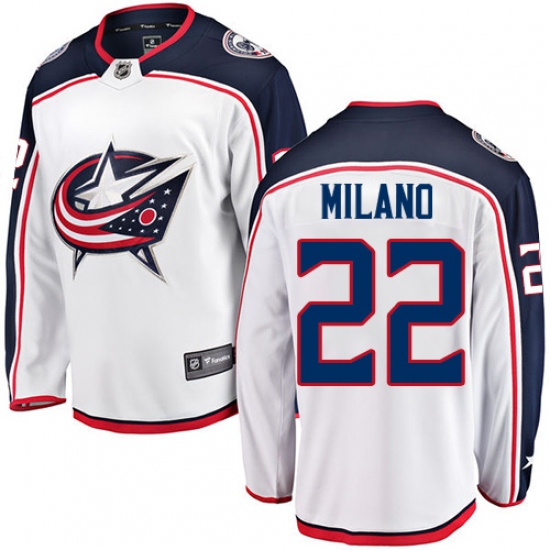 Home>NHL>Columbus Blue Jackets>Sonny Milano>Men's Columbus Blue Jackets #22 Sonny Milano Fanatics Branded White Away Breakaway NHL Jersey