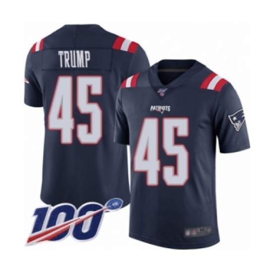 >Men's New England Patriots #45 Donald Trump Limited Navy Blue Rush Vapor Untouchable 100th Season Football Jersey