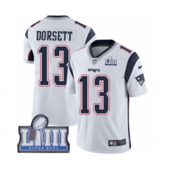 >Men's Nike New England Patriots #13 Phillip Dorsett White Vapor Untouchable Limited Player Super Bowl LIII Bound NFL Jersey