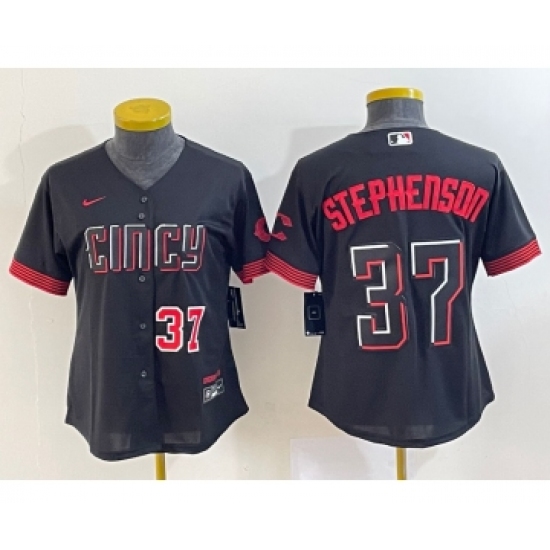 >Women's Cincinnati Reds #37 Tyler Stephenson Number Black 2023 City Connect Cool Base Stitched Jersey