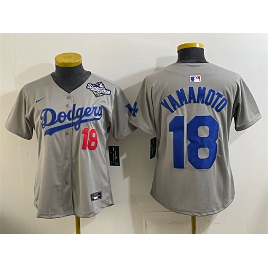 >Women's Los Angeles Dodgers #18 Yoshinobu Yamamoto Grey 2025 World Series Limited Stitched Baseball Jersey(Run Small)