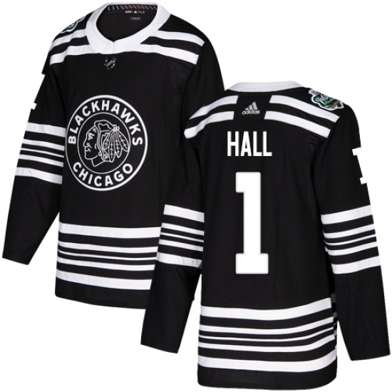 >Youth Adidas Chicago Blackhawks #1 Glenn Hall Authentic Black 2019 Winter Classic NHL Jersey