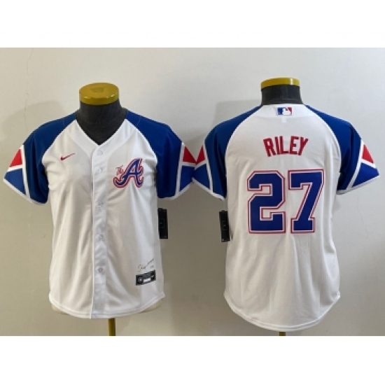 >Youth Atlanta Braves #27 Austin Riley White 2023 City Connect Cool Base Stitched Jersey